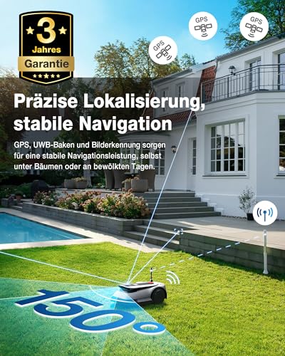 - 【Außergewöhnliche Stabilität und Präzision in der Multifusions-Positionierung und -Navigation】Ausgestattet mit einem Dual-Vision-System, das ein Panorama- und ein Fischaugenobjektiv kombiniert, integriert dieser Mäher UWB-, Trägheitsnavigation und GPS-Technologien für eine zentimetergenaue Positionierung. Dabei behält er seine Stabilität und Genauigkeit selbst in schattigen Bereichen mit schwachem Satellitensignal bei und ist damit perfekt für komplexe Gärten.