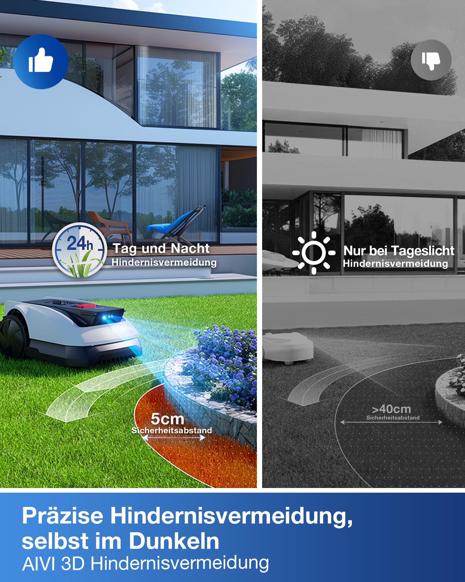 • Erkennt über 200 Hindernisarten: Im Vergleich zu Ultraschallsensoren oder Stoßfängern kann ECOVACS’ AIVI 3D mit einer 150°-Fischaugen-Kamera, unterstützt durch fortschrittliche KI-Algorithmen, und einem 3D-ToF-LiDAR über 200 gängige Gartenobjekte erkennen und Hindernisse vermeiden. Der 3D-ToF-LiDAR misst zudem präzise die Distanz zu Hindernissen, um extrem nahes Stoppen zu ermöglichen. Diese Technologie sorgt für eine hervorragende Hindernisvermeidung und erhöht die Sicherheit im Garten erheblich bei nur minimal ausgelassenen Mähflächen.