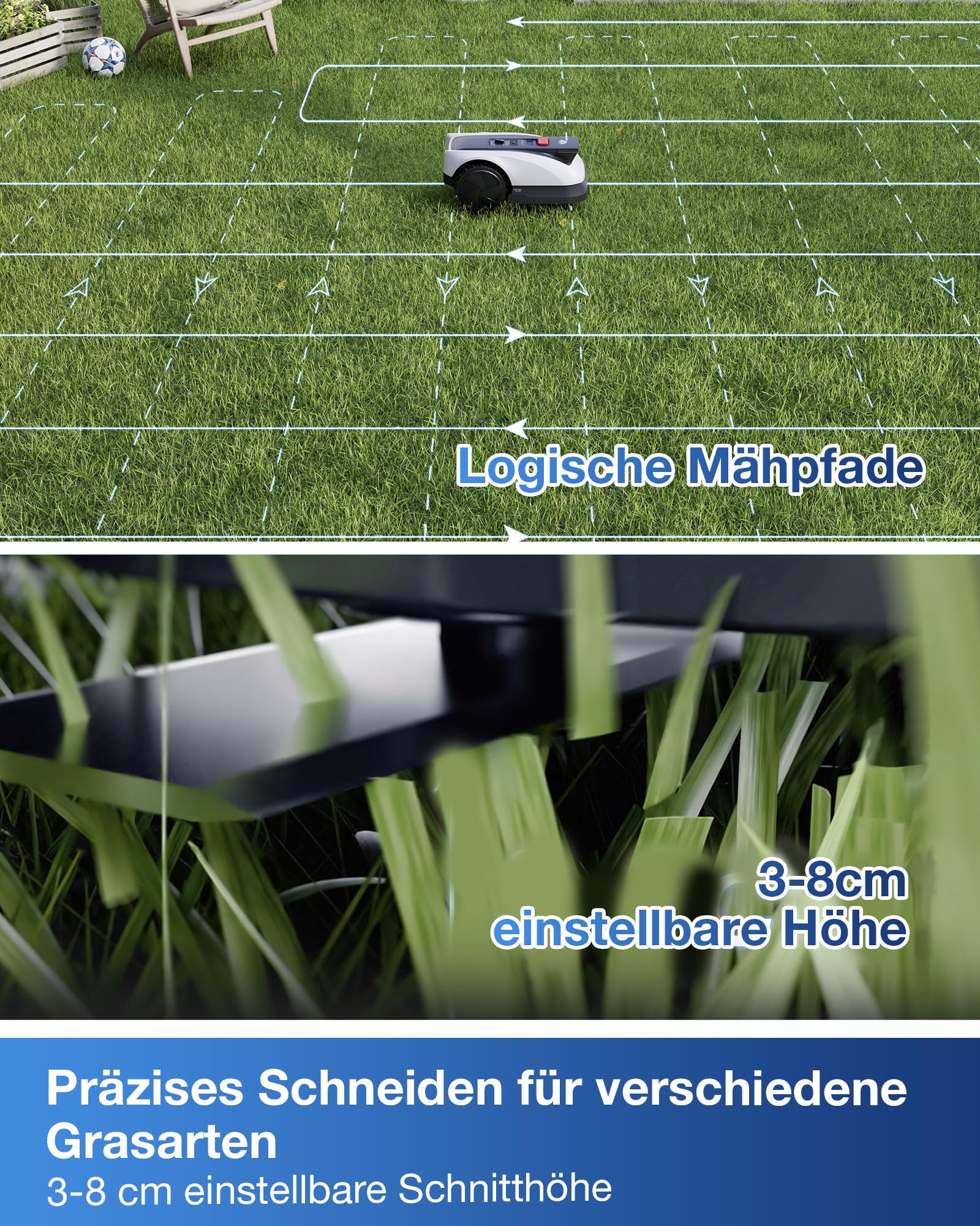 - Mähleistung: 180 m²/h.Ausgestattet mit einem 4000 mAh Akku kann der Roboter bis zu 180 m² pro Stunde bewältigen, mit einer Geschwindigkeit von bis zu 0,5 m/s, bei einer Schnittbreite von 220 mm.