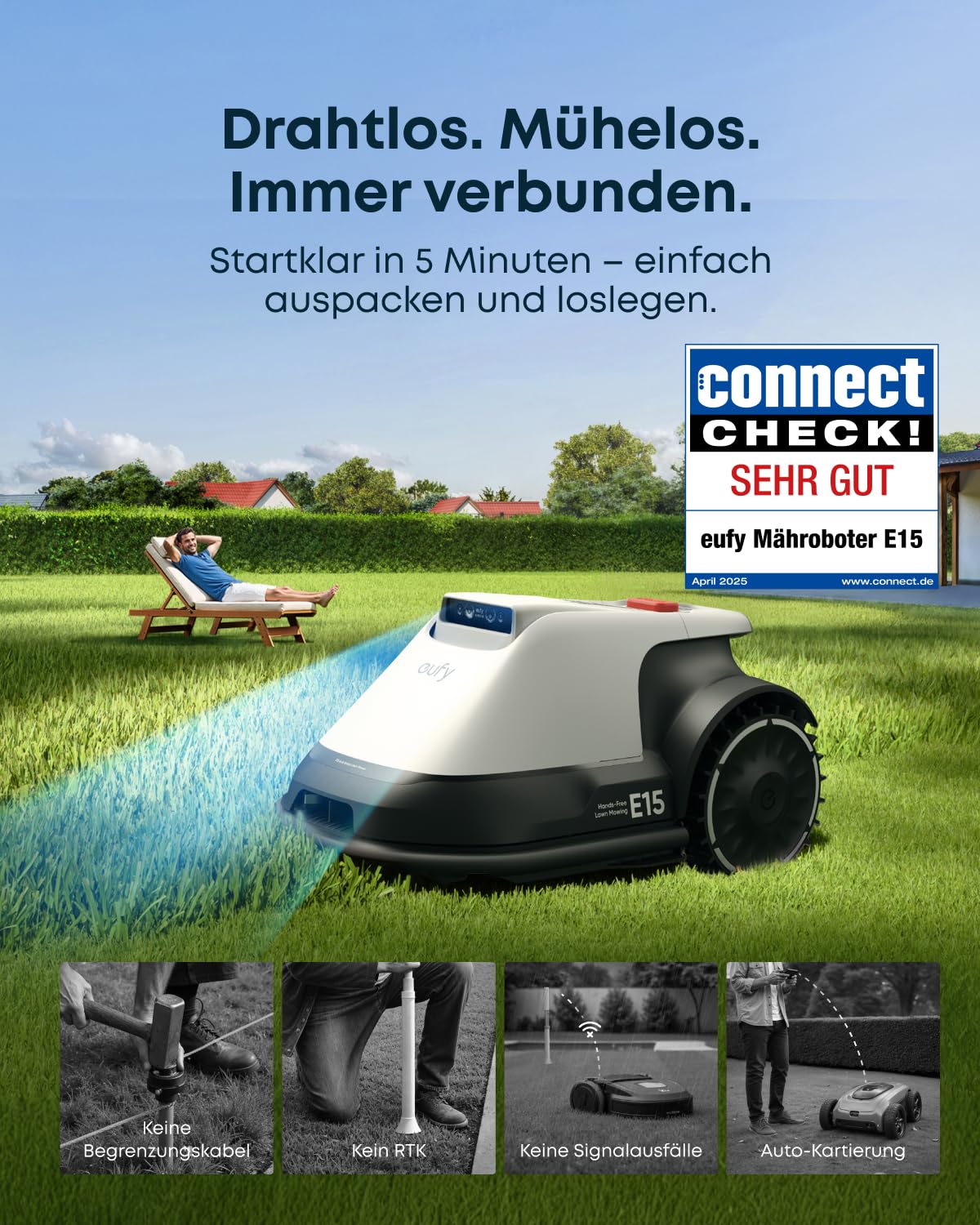 eufy E15 Mähroboter ohne Begrenzungskabel, Keine Signalausfälle, Kein RTK, TrueVision Technologie, Smart-Navigation, Garten bis 800m², Präzisionsrandschnitt, Hindernisvermeidung, App-Steuerung