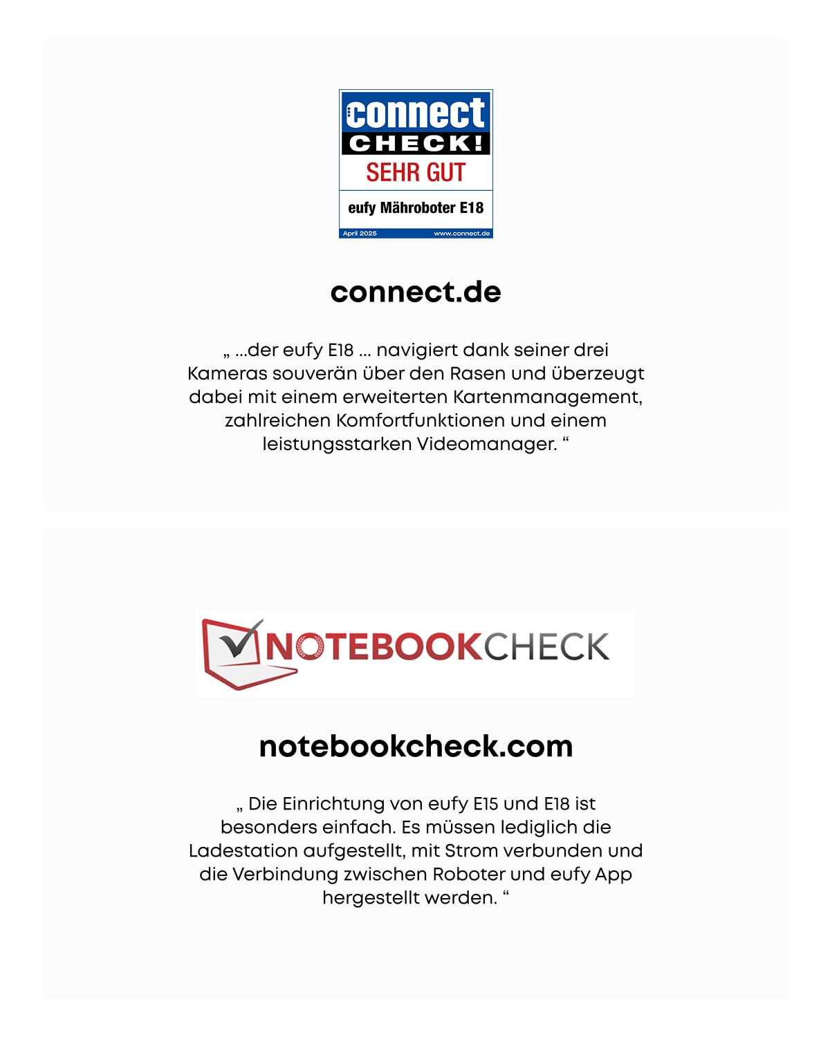 - Kein Begrenzungsdraht, kein RTK, keine Signalausfälle: Die TrueVision-Technologie des E18 kartiert den Rasen autonom – ohne aufwendige Setups. Präzise Kameras und smarte Algorithmen erkennen Kanten und Hindernisse für eine zuverlässige Navigation.