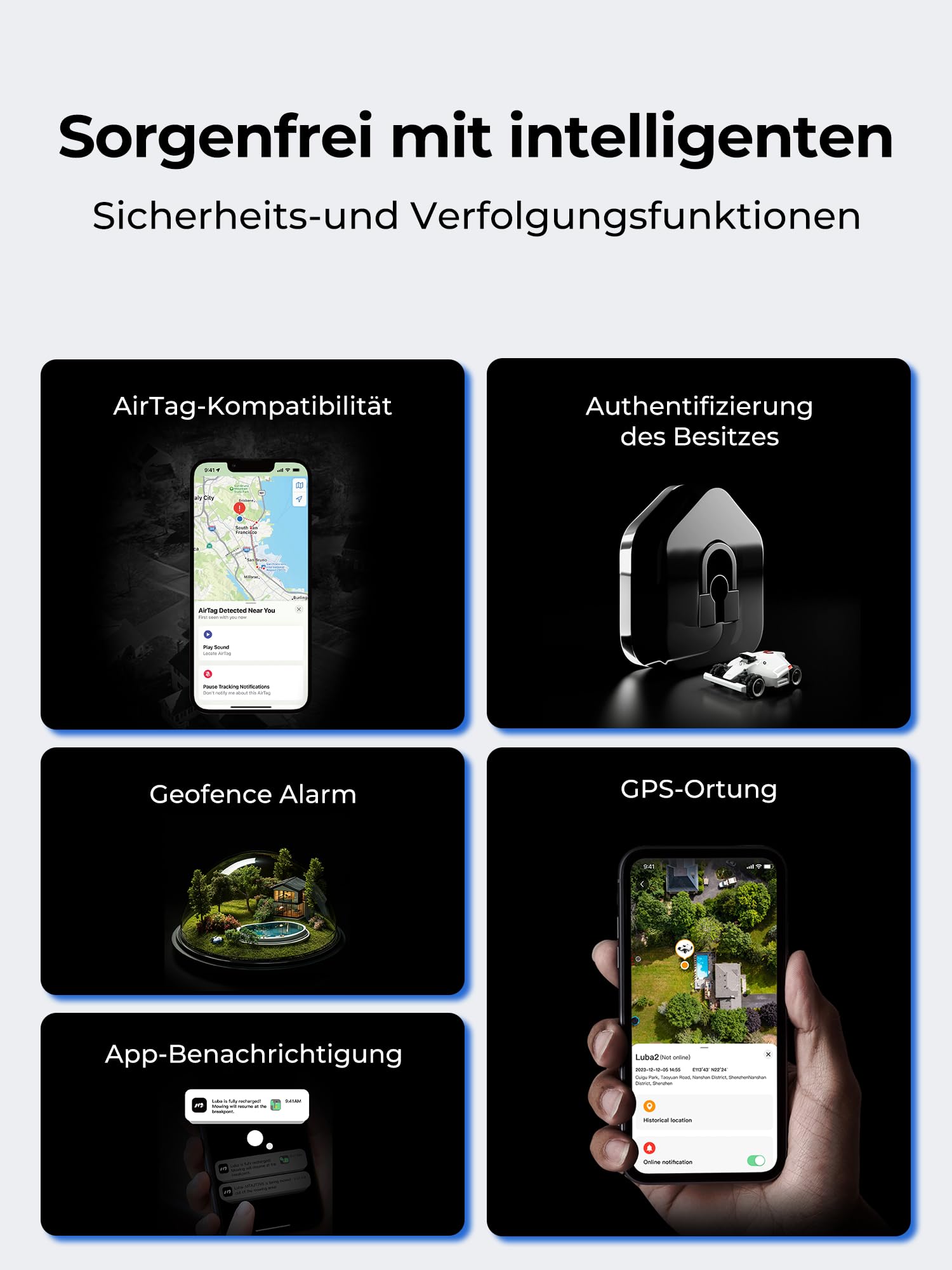 - 3D Vision & RTK Fusion Mapping System: Das duale 3D-Vision- und RTK-Navigationssystem ist unabhängig von den Lichtverhältnissen und der Signalstärke und gewährleistet eine zentimetergenaue Positionierung selbst in Höfen mit mehr als 50 % Hindernissen und auf Flächen von bis zu 3,000 Quadratmetern. Mit seinem binokularen 3D-Sichtsystem verfügt LUBA über eine sensible Wahrnehmung und präzise Positionierung. Enhanced RTK kann mit dem heimischen Wi-Fi verbunden werden und bietet eine Signalabdeckung von bis zu 5 km