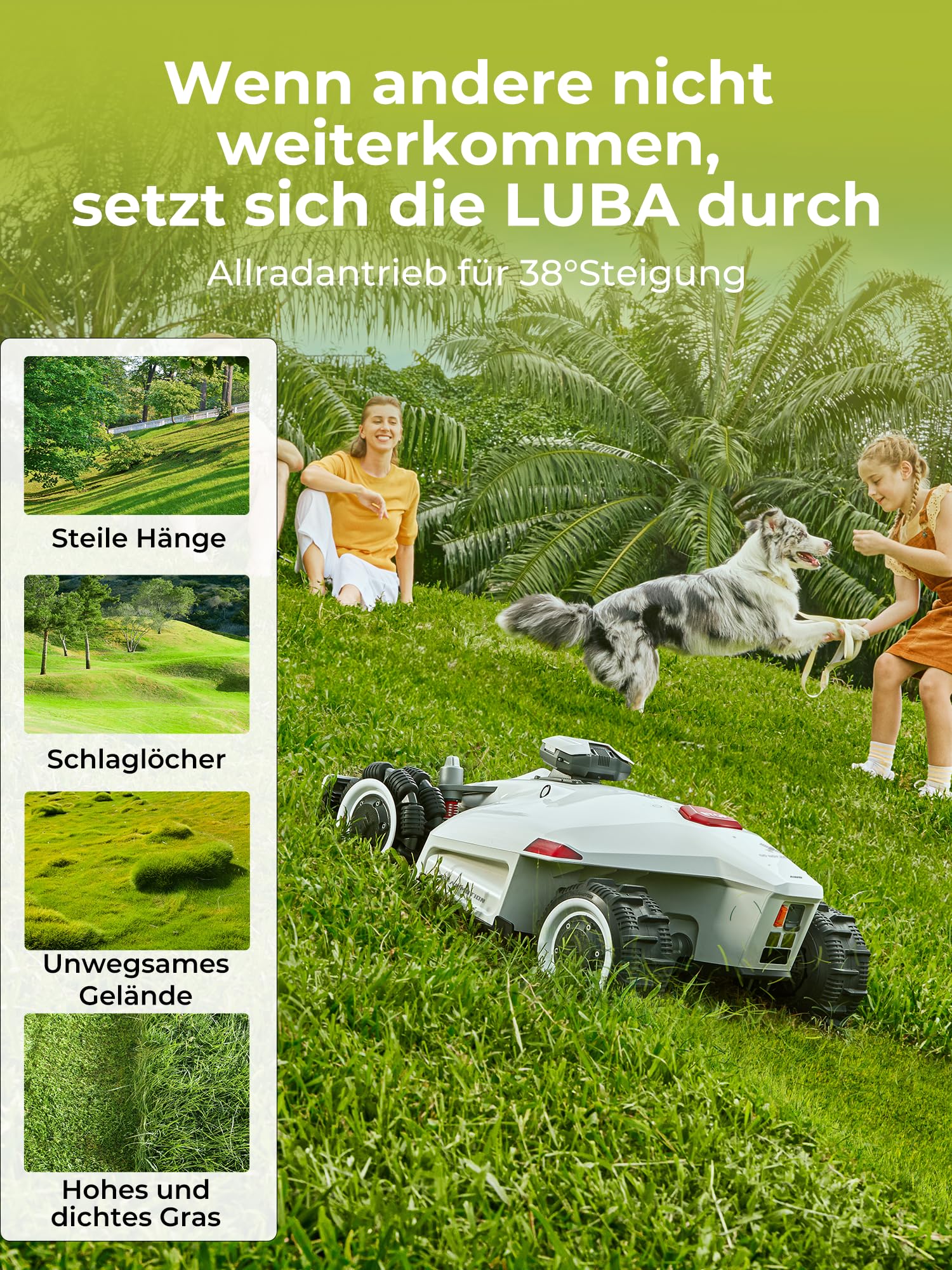 - Allradantrieb für Steigungen bis 38°: Der Luba 2 AWD Mähroboter mit vier Radnabenmotoren überwindet Steigungen bis zu 80 % und bietet dank doppelter Aufhängung verbesserte Stoßdämpfung. Der Allradantrieb (AWD) sorgt für stabile Leistung bei Hindernissen. Im Gegensatz zu herkömmlichen Robotern, die bei Gräben, Schlamm oder unebenem Gelände stecken bleiben, arbeitet der Luba 2 AWD ruhig und ohne Unterbrechung