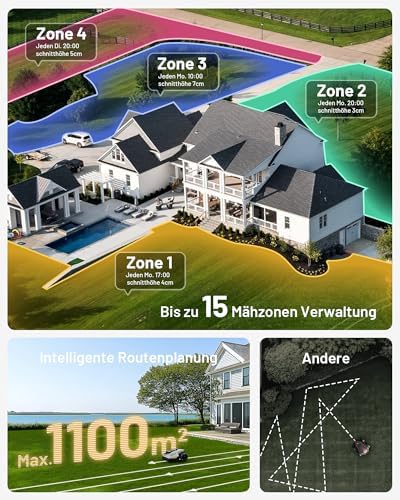 - Leichter, aber Intelligenter: Der YUKA mini passt sich Ihren Bedürfnissen an und verwaltet bis zu 15 Mähzonen mit benutzerdefinierten Aufgaben und Richtungen, während er automatisch Pfade zwischen ihnen erstellt - ohne manuelles Heben. Legen Sie No-Go-Zonen für Blumenbeete, Pools und Spielbereiche fest, und der YUKA mini wird sie strikt meiden.