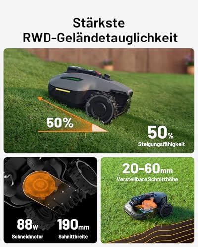 - Die stärkste RWD-Geländetauglichkeit: Angetrieben durch das robuste Motorsystem und die übergroßen Geländeräder erklimmt der YUKA mini mühelos Steigungen von bis zu 50% und überwindet vertikale Hindernisse von bis zu 3,5 cm Höhe. Sein 88-Watt-Mähmotor ist perfekt geeignet, um eine breite Palette von Grasarten mit Leichtigkeit zu bearbeiten.