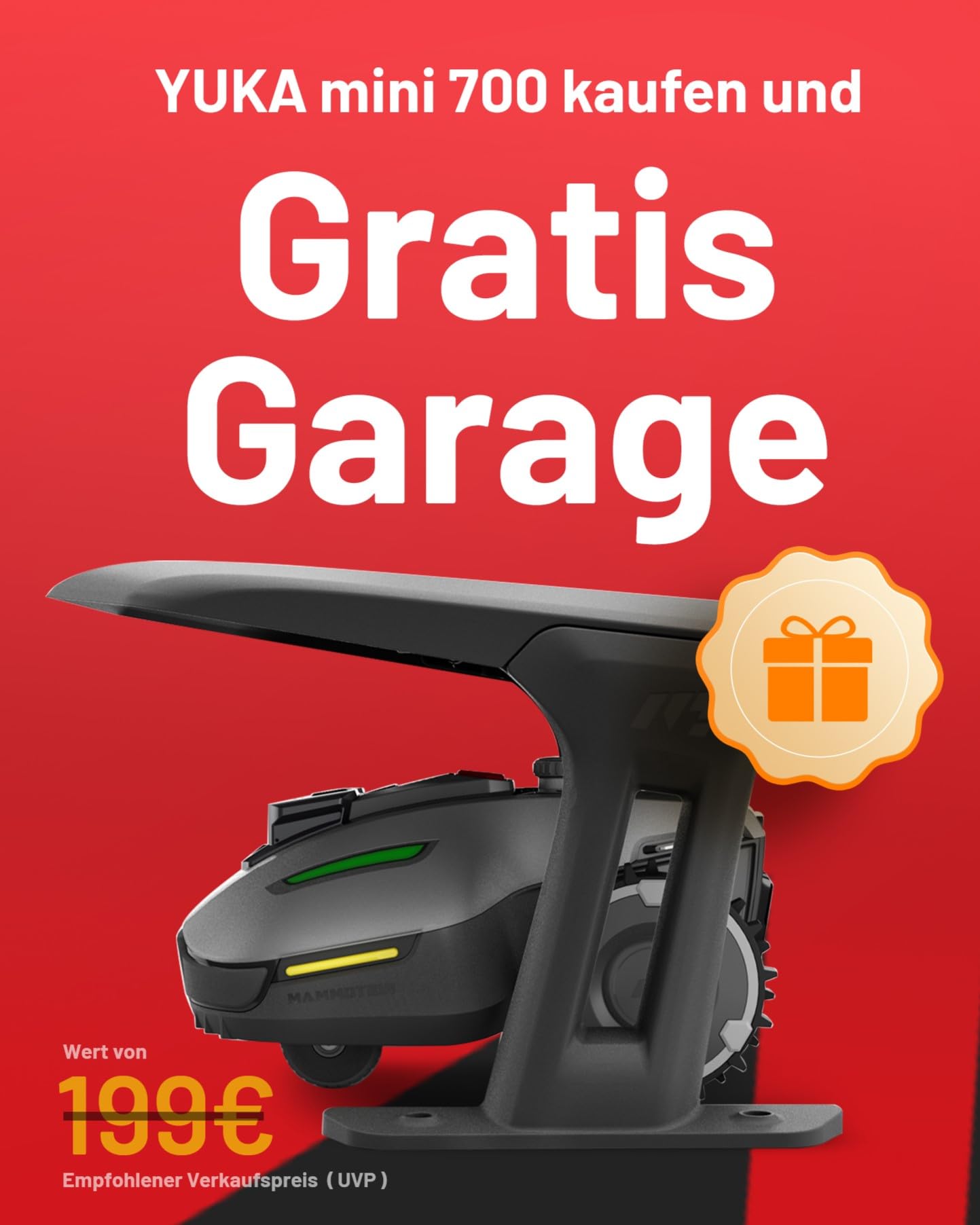 - Der YUKA Mini 700 Mähroboter und die Garage werden separat geliefert. Bitte legen Sie die Garage beim Bestellen mit in den Warenkorb und schließen Sie die Bestellung gemeinsam ab. Der Aktionsrabatt wird beim Bezahlen automatisch angewendet. Wenn Sie Fragen haben, kontaktieren Sie uns bitte jederzeit.