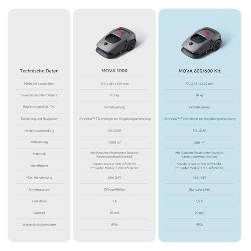 - [Präzise Position, Bereit für den Outdoor-Einsatz] Anders als herkömmliches GPS verbessert die UltraView-Technologie die Positionsgenauigkeit deutlich. Durch das Scannen von Punktwolken in Echtzeit ist der MOVA 600 in der Lage, verschiedene komplexe Outdoor-Bedingungen zu bewältigen und effizient bei schwachem Licht, hellem Licht und auf flachem oder geneigtem Gelände (bis zu 45 %/24°) zu mähen