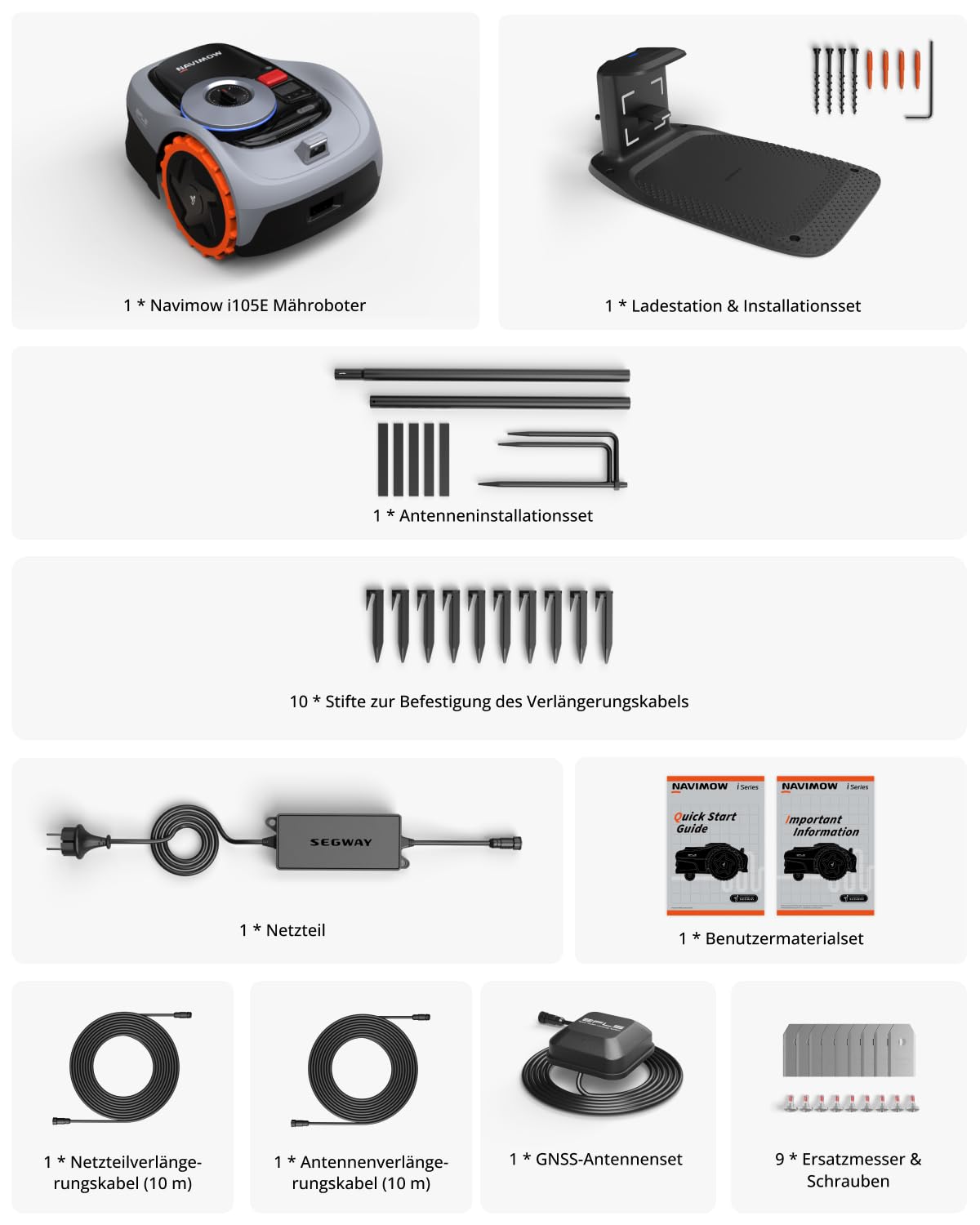 - Lieferumfang: 1 * Navimow i105E Mähroboter ohne Begrenzungsdraht, 1 * Netzteil, 1 * Netzteilverlängerungskabel (10 m), 1 * Antennenverlängerungskabel (10 m), 10 * Stifte zur Befestigung des Verlängerungskabels, 1 * Ladestation & Installationsset, 1 * GNSS-Antennenset, 1 * Antenneninstallationsset, 9 * Ersatzklingen & Schrauben, 1 * Benutzermaterialset.